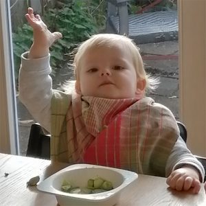 Die spiegel brengt mij bij ons lieve nichtje Ruby (1 jaar) die één dag in de week bij ons is. Wat een feest om de ontwikkeling in zo’n eerste levensjaar mee te maken. Maar om er een boterham in te krijgen valt soms niet mee. Ze leert nu dat degene die ze in de spiegel ziet zijzelf is, maar kan dat nog niet helemaal bevatten. Al spelend met stukjes brood en een spiegel kwam mijn vrouw op het lumineuze idee om Ruby te vragen om het kindje in de spiegel een boterham te geven. Het werkte!